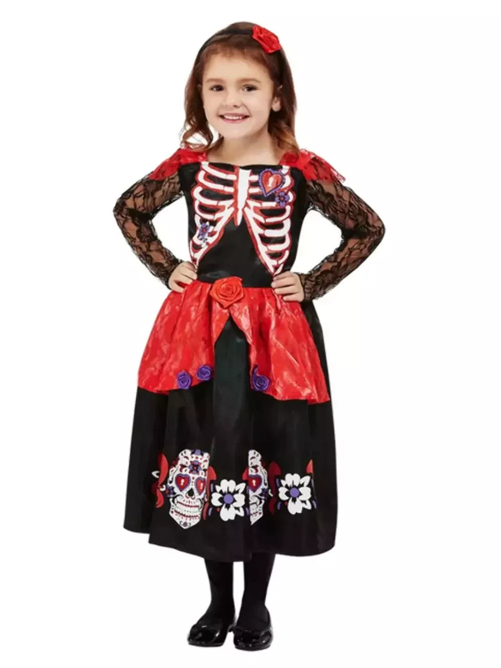 Toddlers Day Of The Dead Girls Costume Skeleton Fancy Dress Outfit Kids